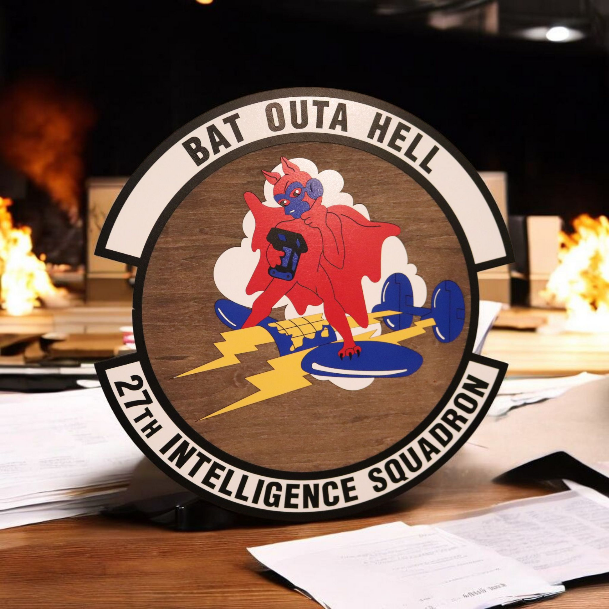 Introducing the 27 IS Patch Plaque - a custom-made 15" plaque perfect for any Hellbat, featuring 103 custom-cut pieces of laminate MDF and white birch, held together by ADHD fueled hyper focus and adhesive. With a personalized engraving option and two-layered construction, this plaque is the ultimate way to say goodbye in style.